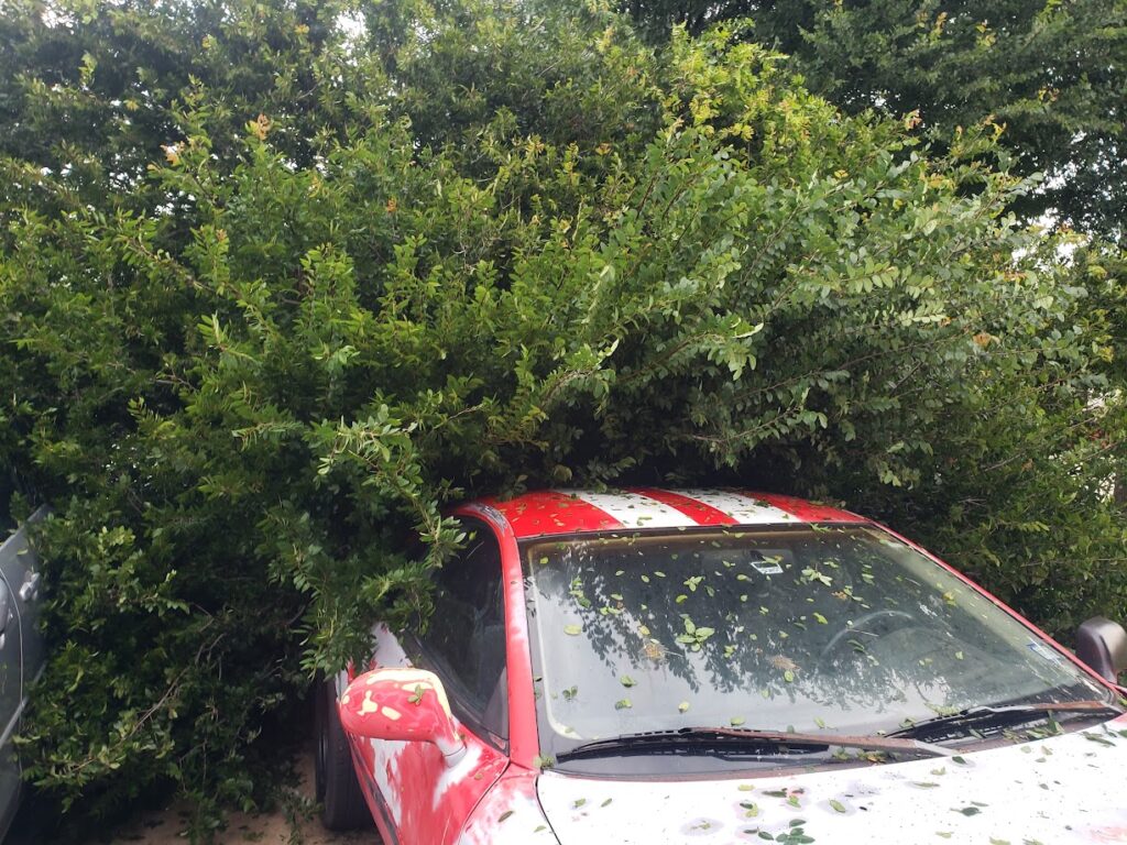 My brother and my dad cut up the tree and removed it from the cars. My brother wasn’t home when it happened, but his car got a lot of hail damage, the tree seemed to protect mine. As it turns out, windshields are faster and cheaper to repair than hail damage.